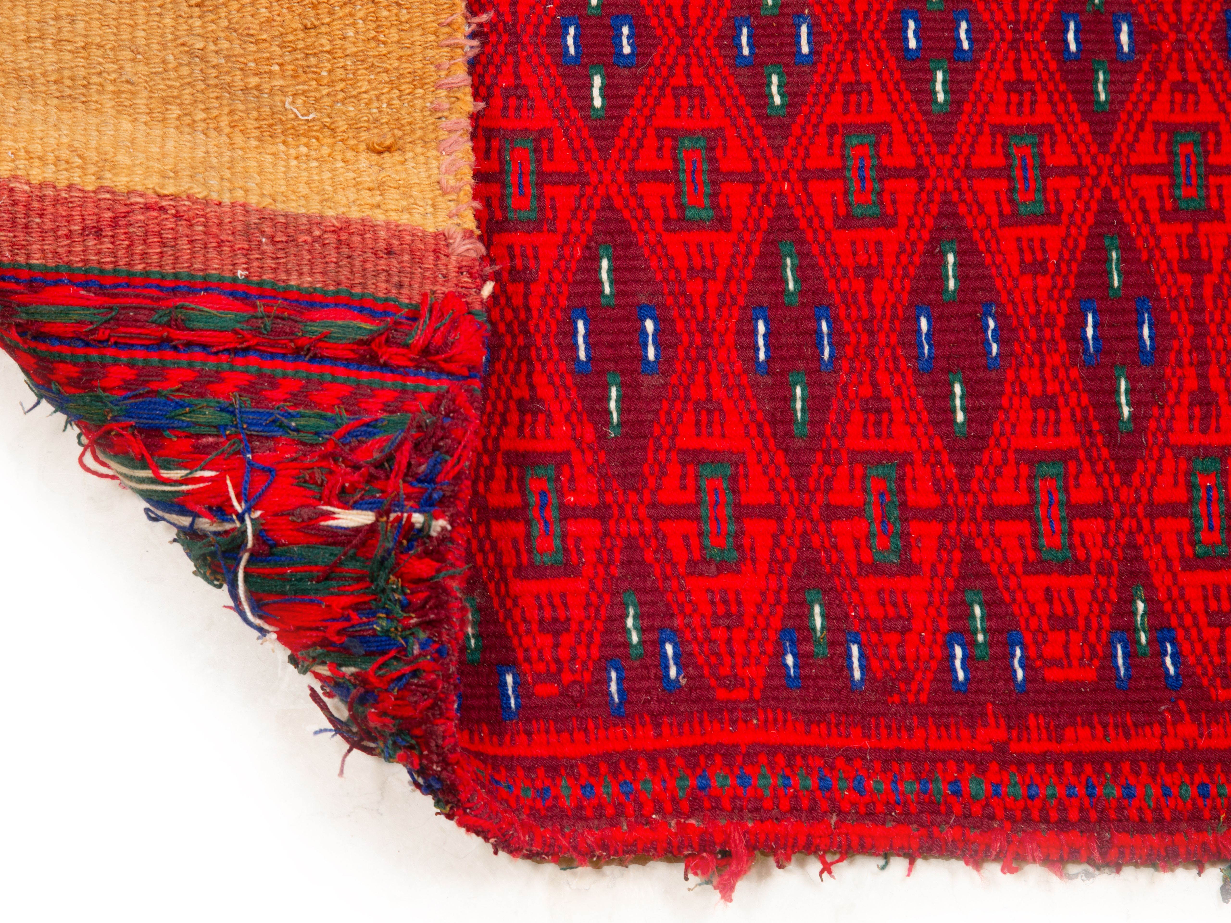 خورجین گلیمی زیبا از پشم گوسفند و 50 ساله از خطه بلوچستان با نقشی ذهنی بی نظیر و بکر با رنگهای گیاهی و گرم و مناسب برای استفاده بعنوان کنار تختی، پادری و یا روانداز مبل و در ابعاد 178 در 58 سانتی متر با وزن 3 کیلوگرم